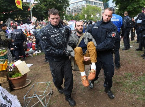10.42 Uhr: Spaghetti-Technik. So nennen die Aktivisten das. Alle Spannung aus dem Körper nehmen, dann ist es schwieriger sie wegzutragen. „Das bindet jedes mal drei Polizisten“, sagt ein Occuy-Sprecher. Auch ein Erfolg.
