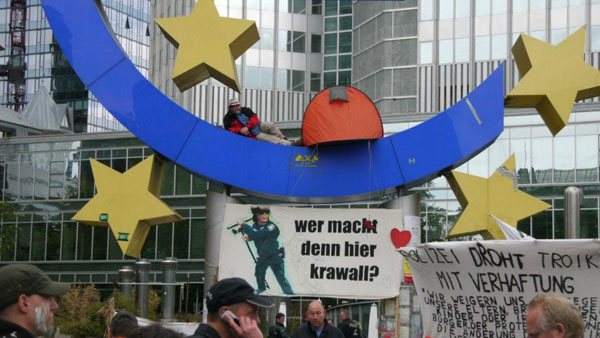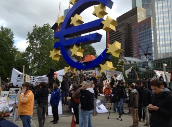 Von Mittwoch bis Samstag haben 40 Organisationen Proteste gegen die Krisenpolitik der EU, der EZB und des Internationalen Währungsfonds in Frankfurt angekündigt. Das Bankenviertel bereitet sich auf eine Belagerung vor, zahlreiche Banken bleiben geschlossen, die Polizei warnt Banker vor dem Tragen von Anzug und Krawatte.