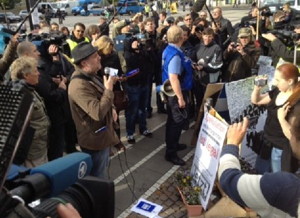 10.14 Uhr: Die Presse blockiert schon einmal mit. Es sind so viele Reporter und Kamerateams am Ort, dass die Polizei beklagt, nicht ordentlich räumen zu können. Ein Transparent mit der Forderung nach „mehr Schichtzulage“ wollen die Polizisten aber hängen lassen. Dafür seien sie auch, sagt ein Beamter.
