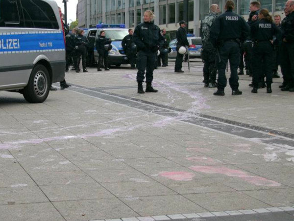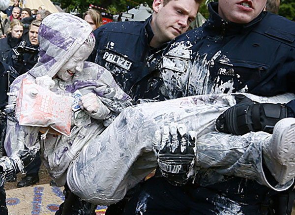 10.00 Uhr: Einige Aktivisten, die sich in ein Plantschbecken voller Farbe gesetzt hatten, bespritzen die Einsatzkräfte. „Das ist kein friedlicher Protest“, erklärt der Einsatzleiter. Aktionen dieser Art führten zur Festnahme.