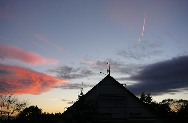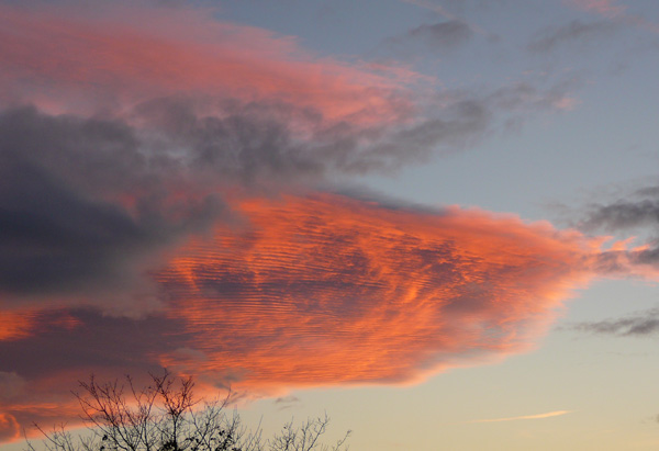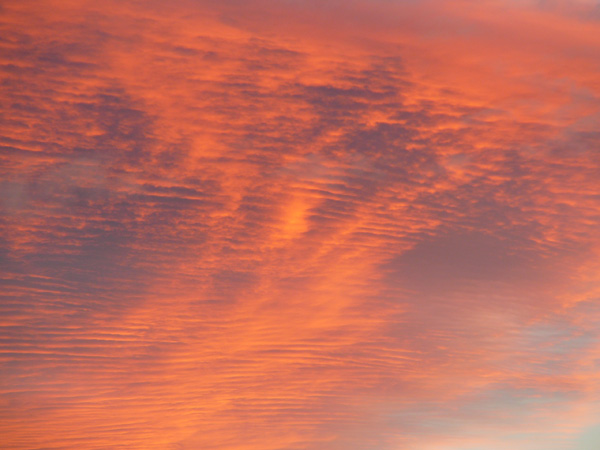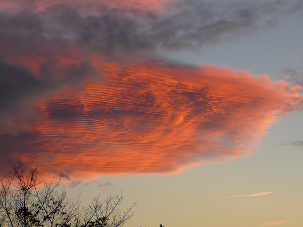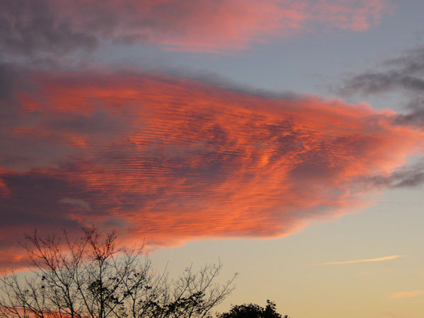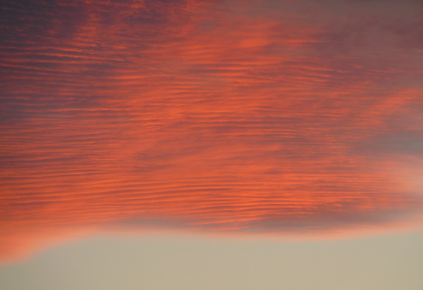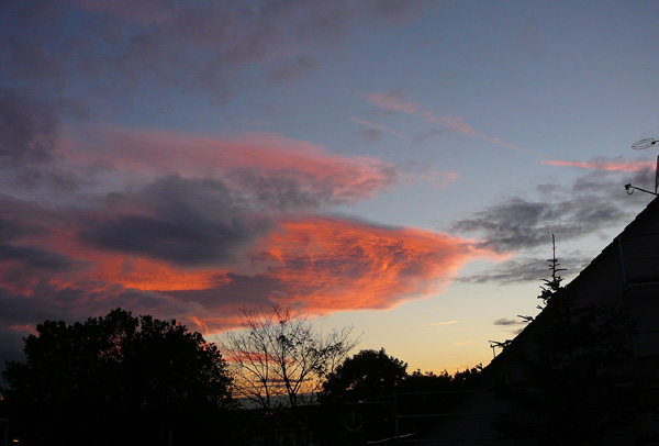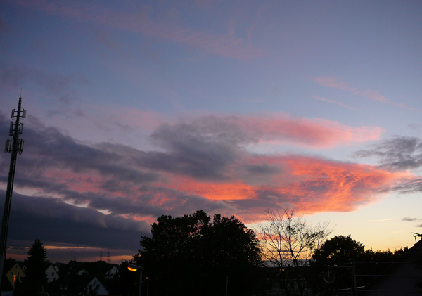 Am heutigen Freitagabend, während dem Sonnenuntergang, erblickte ich aus meinem Fenster im hessischen Dreieich-Offenthal diese phänomenale Wolkenformation. Durch die untergehende Sonne rötlich gefärbt, bilden sich Lamellen oder Streifen in den Wolken. Weiter südlich entsteht bereits eine Gewitterfront und mittendrin der Funkmast…