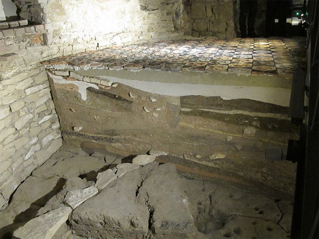 „Am ältesten ist das, was sich unter dem Fußboden befand. Ein Meter unter dem Boden fand sich eine etwa 30 Zentimeter dicke Schicht, die in der Zeit zwischen Anfang des 9. Jahrhunderts und Mitte des 10. Jahrhunderts entstanden ist. In dieser Schicht fanden wir Fragmente von sieben Holzbauten, die an diesem Ort standen. Wir stellen uns nun die Frage, ob sich hier nicht eine Kultstätte für heidnische Rituale befunden hat.“