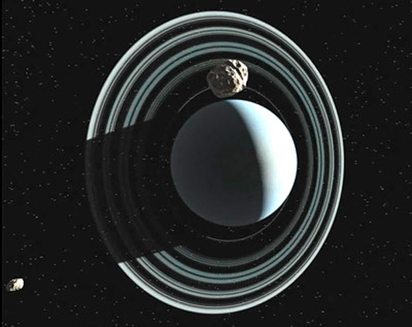 Der Planet Uranus zieht seine Bahn nicht allein: Drei Asteroiden umkreisen die Sonne auf nahezu dem gleichen Orbit. Das zeigen die Beobachtungen und Berechnungen spanischer Astrophysiker. Während einer der drei dem Uranus stets auf seiner Bahn vorauseilt, bewegen sich die anderen beiden im sogenannten Hufeisen-Orbit: Mal sind sie ihm voraus, mal hinken sie hinterher. Das sei das erste Mal, dass man solche Begleiter für den Planeten Uranus identifiziert habe, berichten die Forscher im Fachmagazin „Astronomy & Astrophysics“.