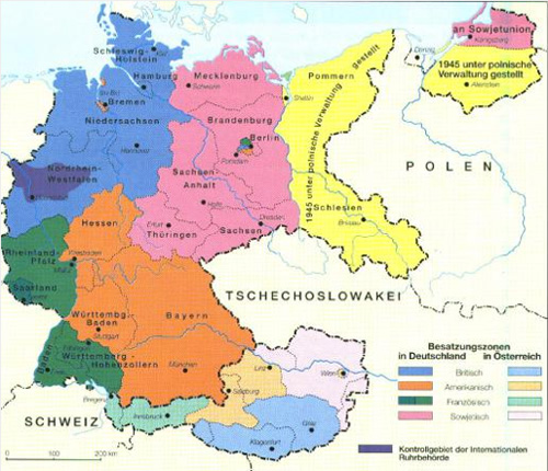 Die Bundesrepublik Deutschland (alt) und die DDR waren Wirtschaftsgebiete, das eine der Westmächte nach kapitalistischer, das andere nach Sozialistischer Prägung unter dem Einfluß kommunistischer Sowjets. Es waren auch Besatzungszonen (wie Titelfoto, 1945).