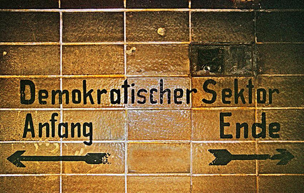 (Wegweiser: Der Schriftzug der Ost-Berliner Administration im Fußgängertunnel des Nordbahnhofs könnte zu Verwirrungen führen. Denn „Demokratischer Sektor“ bezeichnet paradoxerweise den Ostteil Berlins, die Formulierung war bis 1957 in der DDR gebräuchlich)
