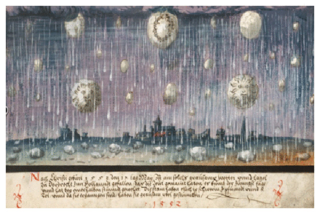 (Bild: Hagel in Dordecht: Am 17. Mai 1552 ist ein solch grausames Unwetter mit Hagel zu Dordecht in Holland niedergegangen, dass die Leute gedacht haben, es käme der jüngste Tag. Und es hat etwas eine halbe Stunde gedauert. Etliche Steine haben ihre schweren Pfund von 8 Lot. Und wo sie herabgefallen sind, haben sie grausam übel gestunken)