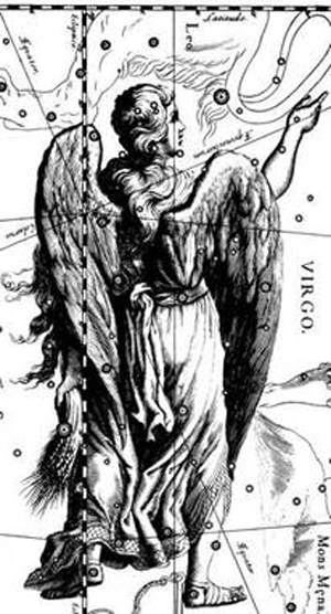 Bei der Jungfrau handelt es sich um das Sternbild “Jungfrau“ (Virgo). Wie zuvor bereits erwähnt, werden die Sternbilder des Tierkreises auch „Häuser“ genannt. Das Sternbild Jungfrau nennt man auch das „Haus des Brotes“, bildlich dargestellt durch eine Frau, welche ein Bündel Weizen hält.