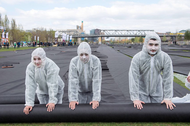 (Kunstaktion in Berlin (am 22. April 2015): Einen Hektar Boden zu versiegeln, kann harte Arbeit sein. Jedenfalls hatten die Männer und Frauen in den weißen Anzügen gut zu tun, die im Park am Gleisdreieck die vorher genau abgemessene Fläche von 10.000 Quadratmetern abdeckten. Sie wollten gegen zu viel Bodenversiegelung protestieren)
