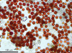 (Die Zysten der Grünalge Haematococcus pluvialis unter dem Mikroskop)