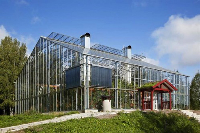 Das Gewächshaus ist etwa doppelt so groß wie das eigentliche Wohngebäude. Auf einer Gesamtfläche von 300 Quadratmetern schaffen die Solvarms ihr eigenes Ökosystem. Das Naturhaus verfügt über ein geschlossenes Abwassersystem, das zur Bewässerung der Pflanzen genutzt wird. Zwei Hochöfen und Solaranlagen an der Außenfassade dienen zur Beheizung. Im Vorraum zwischen Gewächshaus und Wohnung herrschen Temperaturen, die an nicht enden wollende Urlaubstage am Mittelmeer erinnern. Ideal für den Anbau von Obst und Gemüse.
