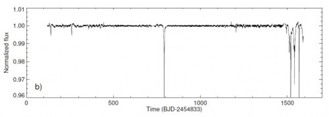 Die Freizeit-Astronomen von “Planet Hunters” fanden dort ein sehr seltsames Verhalten. Anstatt regelmäßiger Verdunkelungen zeigte der Stern unregelmäßige Schwankungen in der Lichtkurve, die man im rechten Teil dieses Diagramms sehen kann: