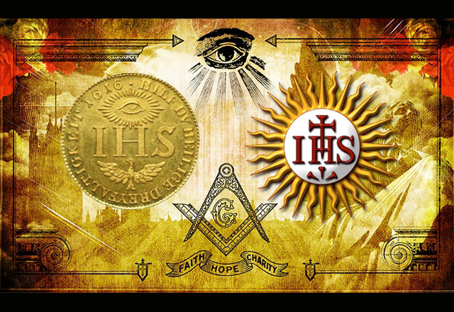 (Goldmünze mit jesuitischem Schriftzug „IHS“ und allsehendem Auge der Illuminaten)