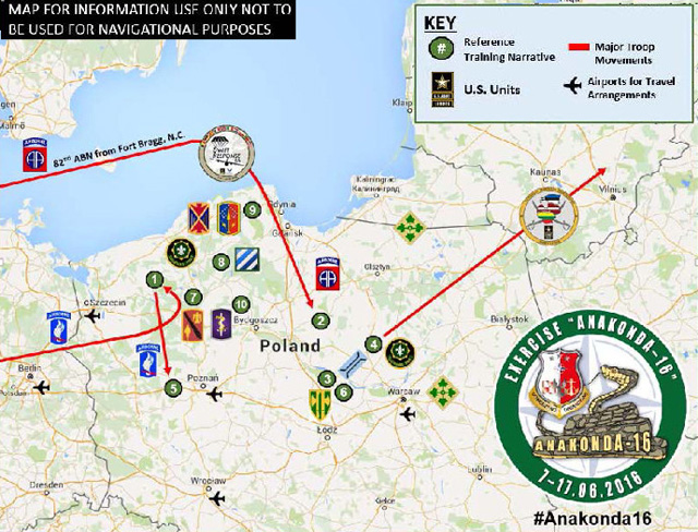 Parallel zu Anakonda 16 finden noch drei weitere Manöver statt, Baltops 16 in und um die Ostsee, Saber Strike 16 in den drei baltischen Staaten und Swift Response in Polen und Deutschland. Nirgendwo sind Zahlen über den genauen Umfang veröffentlicht, aber schätzungsweise sind bei den vier Manövern zwischen 50.000 und 60.000 Soldaten beteiligt.