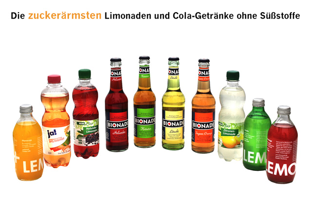 (Die zuckerärmsten Limonaden ohne Süßstoffe im Test sind die „Bionade“-Limos von der Radeberger-Gruppe. Sie enthalten zwischen 4,3 und 5 Prozent Zucker beziehungsweise 3½ bis 4 Würfelzucker je 250ml-Glas. Das macht sie keinesfalls zu gesunden Durstlöschern. Doch das Beispiel zeigt: Eine Limo kommt auch mit weniger Zucker aus)
