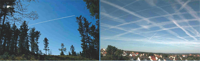 Sogenannte „Chemtrails“ enthalten neben den sowieso in den Flugzeugtreibstoffen (JP8 + l I0) bereits enthaltenen und teilweise gefährlichen chemischen Zuschlagstoffen weitere Chemikalien, Metallstäube, Polymere etc. und weisen je nach Zusammensetzung ein wesentlich dichteres, stärker reflektierenderes Erscheinungsbild auf. Sie beginnen oft dicht an den Turbinen, können stundenlang am Himmel stehenbleiben, zerfließen zu einer milchigen, den Himmel bedeckenden Schicht (white skies) und bilden teilweise oktopusarmartige Ausbuchtungen aus. Diese „weiße Himmelseinfärbung“ wurde übrigens als auffälliges Resultat der im IPCC-Report 2001 (Intergovernmental Panel on Climate Change) empfohlenen Aluminium-Staubausbringung beschrieben.
