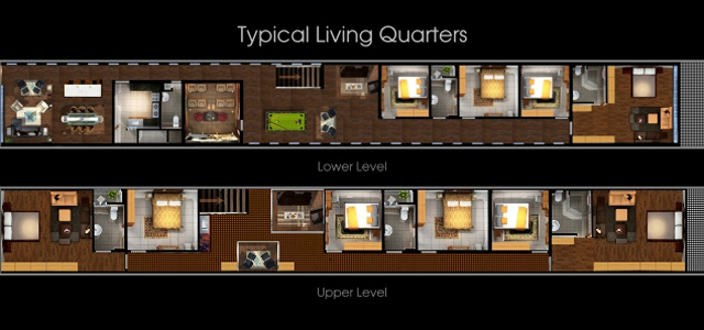 Auch die Wohneinheiten können sich sehen lassen. Individuelle Suiten kosten rund fünf Millionen Dollar und werden an die Wünsche der Kunden angepasst. Sind die Wohnungen einmal fertig, werden sie abgeschlossen. Nur die Familie und das eigene Personal haben dann noch Zugang.