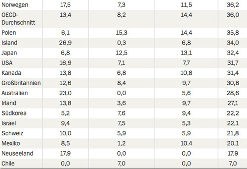 Das ist das Ergebnis einer Studie der Organisation für wirtschaftliche Zusammenarbeit und Entwicklung (OECD), welche die 35 Mitgliedsländer untersuchte. Die Quote lag dabei lediglich in Belgien mit 54,0 Prozent noch höher als in Deutschland, während der OECD-Schnitt bei 36,0 Prozent ist.