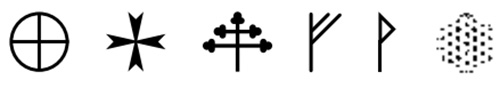 (Symbole sind allgegenwärtig: Radkreuz; Johanniter-/ Malteserkreuz; Kardinalskreuz; Rune Fehu; Rune Wunjo, Blume des Lebens (v. l.).)