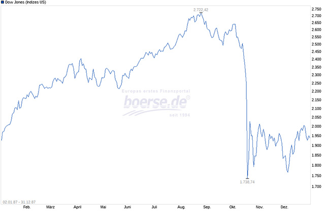 Bis August 1987 lief diese Aufwärtsbewegung, bis es zu einem Wendepunkt kam. Der US-Dollar wurde immer schwächer, weshalb die US-Notenbank die kurzfristigen Zinsen anhob. Doch diese Maßnahme, die die Währung stützen sollte, sorgte vielmehr für Unsicherheit an den Märkten. Dadurch sank der Dow Jones von August bis Mitte Oktober bereits um 475 Punkte, beziehungsweise 17 Prozent.