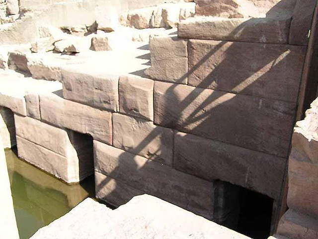 Die Haupthalle steht rund zwanzig Zentimeter unter Wasser, und man erkennt deutlich, dass sich im Boden mehrere ebenfalls exakt quadratische Schächte befinden, von denen man nicht weiß, wohin sie führ(t)en. Wenn man nicht weiß, dass es sich bei den verbauten Blöcken um Granit handelt, erscheint die gesamte Anlage recht modern, schon aufgrund der exakt rechtwinkligen Strukturen.