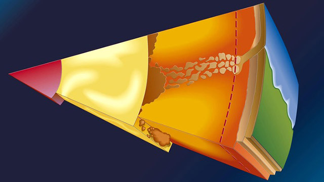 An den Grenzen der Platten kann das heiße Magma aus dem Erdinneren die Erdkruste aufbrechen und sich einen Weg an die Erdoberfläche bahnen.
