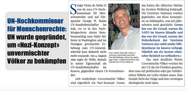 „Die Vereinten Nationen wurden gegründet, um diese Konzeption (Anm: unvermischte Völker) zu bekämpfen, was seit Jahrzehnten auch geschieht. Genau das war der Grund, warum die NATO im Kosovo kämpfte […] Nämlich um ein System ethnischer Reinheit zu verhindern.“ Sérgio Vieira de Mello (†), ehemaliger UN-Hochkommissar für Menschenrechte
