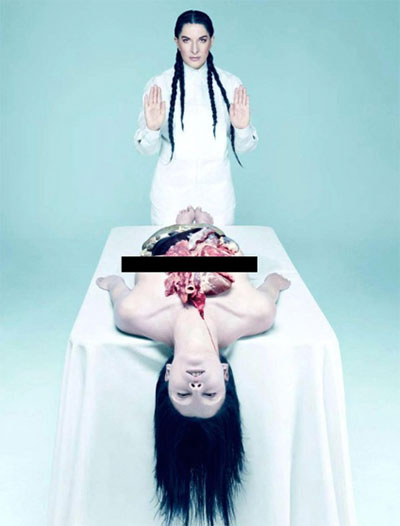 (Bei diesem Foto-Shooting für ein Magazin steht Abramovic vor einem Model mit herausgenommenen Innereien. Man könnte noch viel mehr solcher Bilder einfügen … es gibt etliche davon)