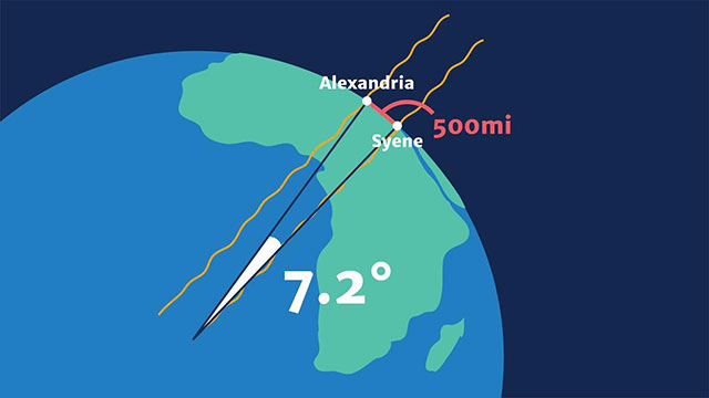 Damit konnte er eine schnelle Berechnung durchführen. Da das Sonnenlicht in Assuan direkt von oben und in Alexandria in einem Winkel von 7,2 Grad einfiel, sollte der Abstand zwischen ihnen 7,2 Grad der 360 Grad der Kugel betragen, die die Erde darstellt.