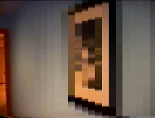 Einige Bilder waren so abscheulich, dass die Polizei sie im Durchsuchungsvideo zensierte. Dieses Bild soll ein 6-jähriges Mädchen zeigen, das sich in einem winzigen Kleid bückt.