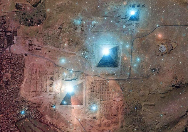 Die drei Pyramiden simulieren exakt die Sterne Delta Orionis [Mintaka], Epsilon [Alnilam] und Zeta [Alnitak], die den Oriongürtel bilden (Wie wurden die Pyramiden erbaut? Die schwebenden Steine des Alten Ägypten (Video)).