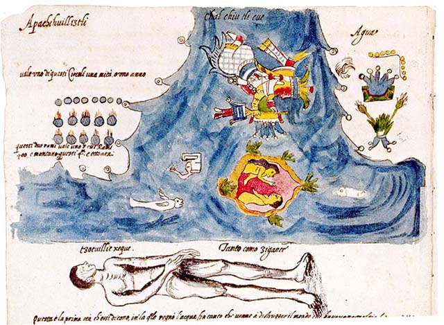 Ixtlilxochitl beschrieb die Wanderung der Völker der westlichen Hemisphäre in den vier Zeitaltern der Welt. Das erste Zeitalter endete in der Sintflut. Im zweiten Zeitalter, „Sonne des Erdbebens“ genannt, lebte die Generation der Riesen, die in der Katastrophe vernichtet wurde, welche dieses Zeitalter beendete. Das dritte Periode war „die Sonne des Windes“, so genannt, weil am Ende dieser Periode schreckliche Hurrikane alles vernichteten.