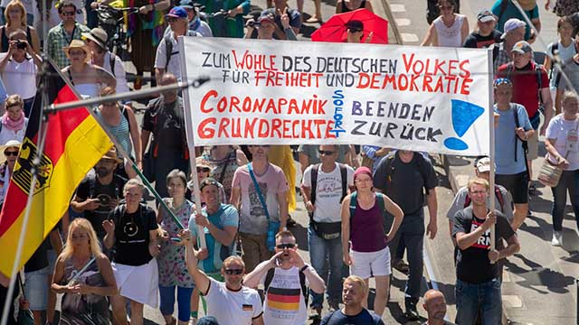 Nach Worten Schuberts wurden die Bürger seit Beginn 2020 gezielt von Politik und Medien mit apokalyptischen Horrorszenarien konfrontiert, so glich nach Worten Schuberts die tägliche Veröffentlichung der Corona-Todeszahlen einer Kriegsberichterstattung.