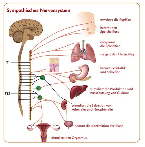 Auf den Autobahnen des vegetativen Nervensystems werden fortlaufend Impulse aus den tiefen Gehirnschichten zu den Körperorganen und wieder zurück gesendet. Dabei fungiert der Sympathikus als eine Art Beschleuniger: Mit der Freisetzung der Hormone Adrenalin und Noradrenalin aktiviert er das Organgewebe, erweitert die Atemwege, beschleunigt den Herzschlag und treibt den Blutdruck in die Höhe.