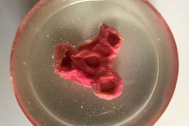 Wenn man seine eigenen Zellen dann knapp drei Monate lang in einer warmen Umgebung aufbewahrt und regelmäßig mit dem Menschenserum „füttert“, wächst daraus ein kleines Stück Fleisch, das man wiederum als Steak verzehren kann.