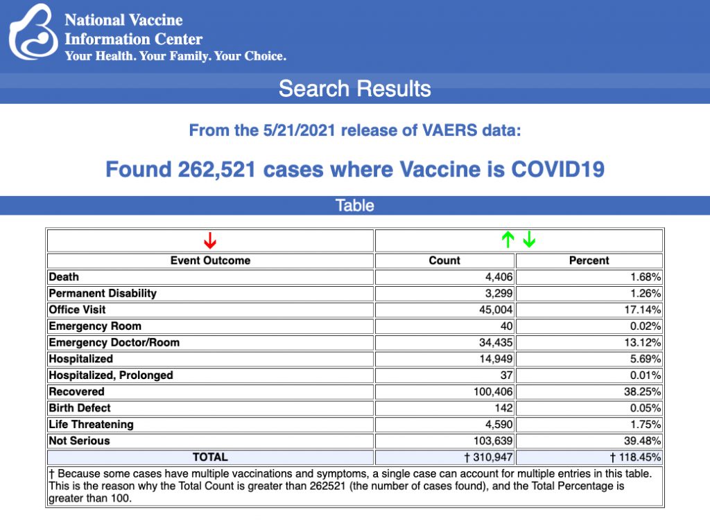 Die Webseite von Robert F. Kennedy Jr. childrenshealthdefense.org berichtet: Die am Freitag veröffentlichten VAERS-Daten zeigen 262’521 Berichte über unerwünschte Ereignisse nach COVID-Impfstoffen, darunter 4406 Todesfälle und 21’537 schwere Verletzungen zwischen dem 14. Dezember 2020 und dem 21. Mai 2021.