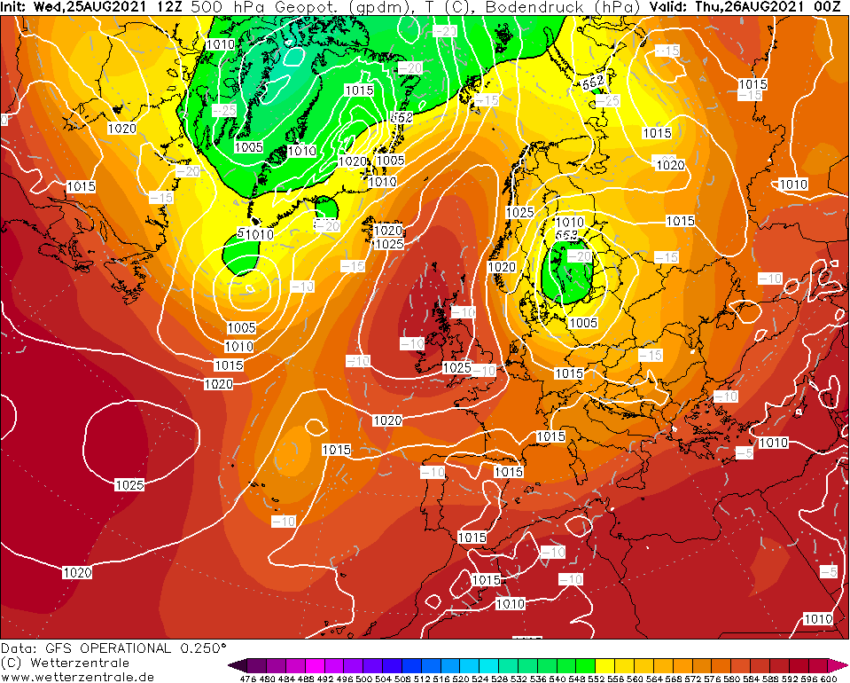 Vorhersagekarte des GFS für den 26.08.2021. Zwischen hohem Luftdruck, der von Großbritannien zum Nordmeer reichte, und einem Ostsee-Tief strömte feucht-kalte, wolkenreiche Polarluft nach Mitteleuropa, die danach für mehrere Tage das Wetter bestimmte.