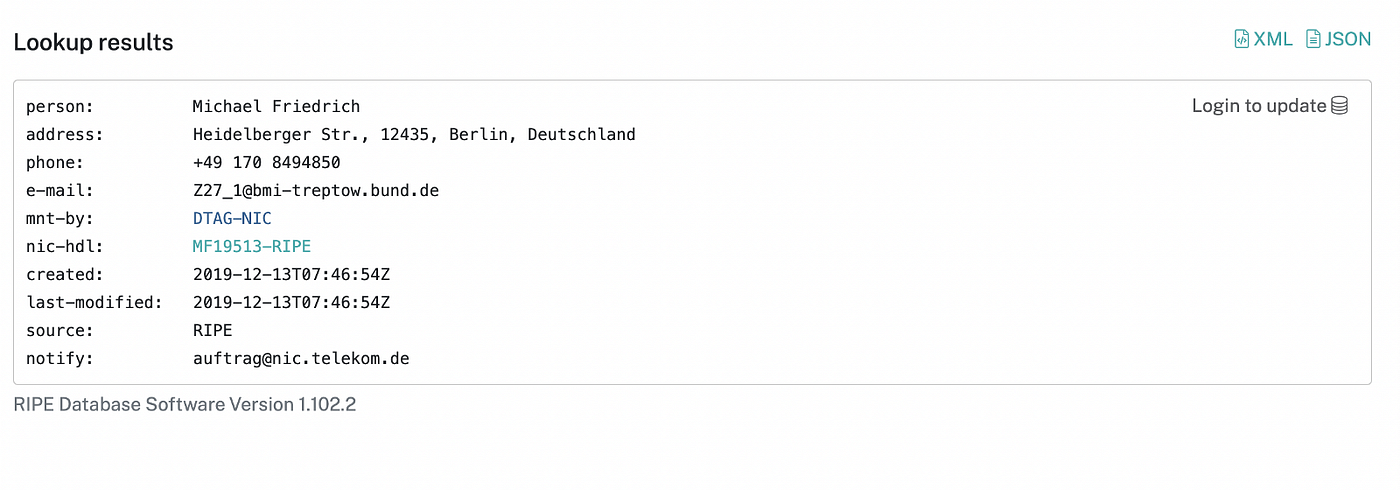 In der RIPE-Datenbank, ein Verzeichnis der europäischen IP-Adressen, in dem man deren Eigentümer feststellen kann, konnte man die IP-Adresse für den Anschluss dieses 2500-Quadratmeter-Büros einem Herrn mit einer E-Mail-Adresse des Bundesinnenministeriums zuordnen. Der Versuch, diese Adresse zu entschlüsseln und wohin sie genau führte, war nicht einfach.