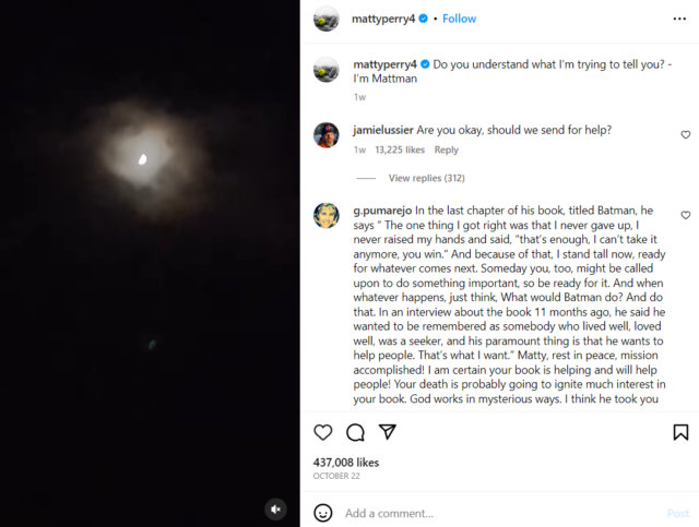 Auch wenn diese Tatsachen leicht von der Hand zu weisen scheinen, wurden sie alle in Perrys letzten Instagram-Posts erwähnt. Die Fledermaussignale zeigten an, dass er in Not war. Der Halloween-Kürbis bezog sich auf Samhain und den Zeitpunkt seines Todes. Bilder des Mondes verwiesen auf den bevorstehenden Vollmond, den genauen Moment, in dem er sterben würde.