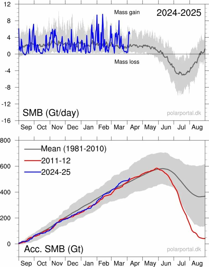 Der Anstieg vom Wochenende ist auch kein Einzelfall. Die tägliche SMB-Grafik zeigt monatelang eine regelmäßige Akkumulation, die von starken Zuwächsen unterbrochen wird – eine Realität, die weit von den alarmistischen Behauptungen entfernt ist.