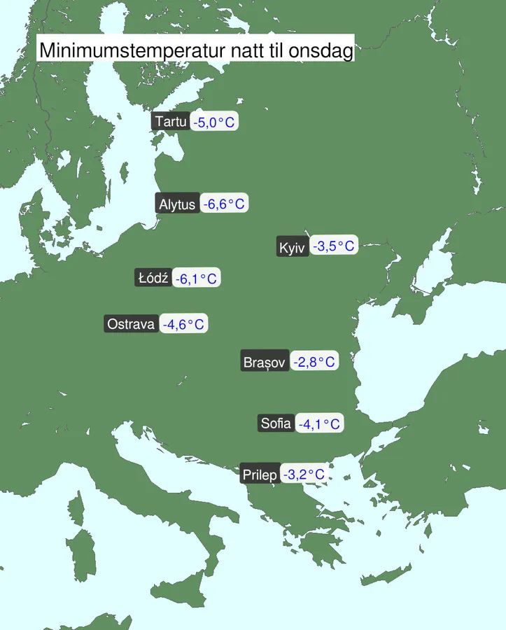 In der Nacht zum Mittwoch erreichten Städte wie Alytus in Litauen Tiefstwerte von -6,6 °C, während es in Łódź in Zentralpolen -6,1 °C kalt wurde. Auch weiter südlich sanken die Temperaturen in den Minusbereich: In Kiew wurden -3,5 °C und in Sofia -4,1 °C gemessen.