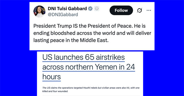 Die USA starteten 65 Luftangriffe in 24 Stunden im Jemen, und Trumps Geheimdienstchefin Tulsi Gabbard tweetete, „Präsident Trump IST der Präsident des Friedens. Er beendet das Blutvergießen auf der ganzen Welt und wird für dauerhaften Frieden im Nahen Osten sorgen.“
