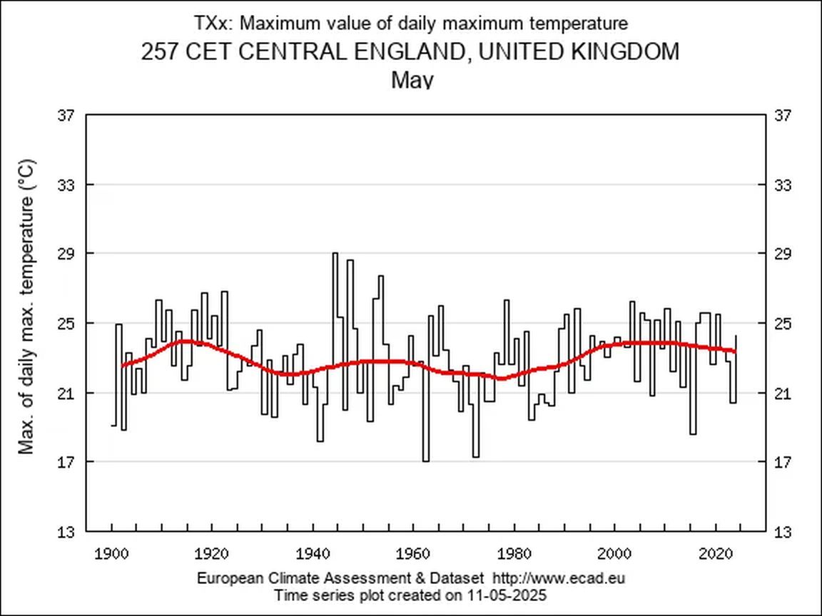 In Wirklichkeit zeigen die langjährigen Aufzeichnungen für Mittelengland jedoch, dass Mai-Temperaturen von Mitte 20 Grad nichts Ungewöhnliches sind. Der Geologe und Klimaforscher John Dodders weist sogar darauf hin, dass es bei den Tageshöchsttemperaturen im Mai keinen Trend gibt, wenn man die Daten bis ins Jahr 1900 zurückverfolgt: