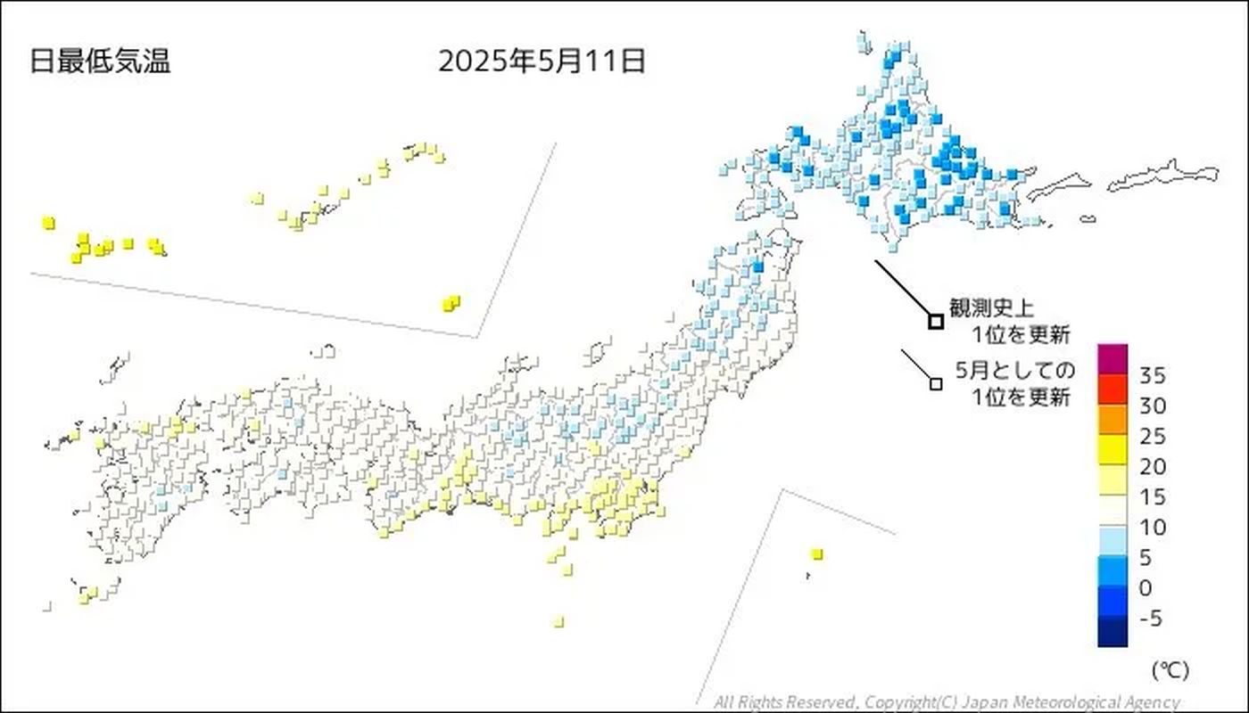 Die Japanische Meteorologische Agentur (JMA) registrierte Dutzende von Stationen, die die Mai-Tiefsttemperatur-Rekorde bedrohten, insbesondere in den nördlichen Regionen und im Landesinneren.