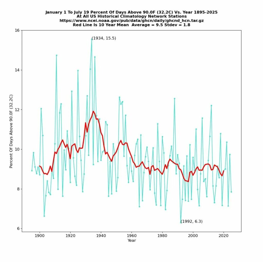 Der diesjährige Prozentsatz liegt auch fast 50 % unter dem Höchstwert von 1936, als 15,5 % der Tage zu diesem Zeitpunkt des Jahres über 90 F lagen. Trotz der jahrzehntelangen Hitzetreiberei und der 90-jährigen Zunahme des CO₂-Gehalts in der Atmosphäre dominieren immer noch die historischen Hitzerekorde der 1930er Jahre: