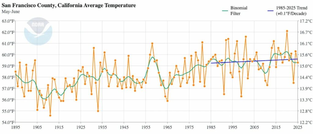 Bei der Durchsicht historischer Darstellungen: Selbst mit den Tricks der NOAA zur Datenmanipulation und UHI-Unterdrückung ist dies alles, was sie für die Erwärmung von San Francisco County seit 1895 zeigen können – und seit 1985 sind es kaum 0,1 F pro Jahrzehnt:
