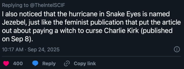 #9 „Jezebel“ ist der Name des Hurrikans im Film. Ein Internet-Detektiv hat richtigerweise darauf hingewiesen, dass Jezebel auch der Name der feministischen Zeitschrift ist, die Hexen anheuerte, um Charlie Kirk kurz vor seiner Ermordung zu verfluchen …