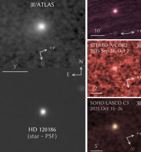 In einer am 28. Oktober veröffentlichten Studie der Astronomen Qicheng Zhang und Karl Battams werden Bilder von 3I/Atlas analysiert, die von drei nach der Sonne gerichteten Koronografen (Stereo-A, SOHO und GOES-19) aufgenommen wurden. Die Analysen zeigen, dass 3I/Atlas sich beim Erreichen des Perihels rapide aufhellt. Die Gründe dafür sind den Autoren unbekannt.