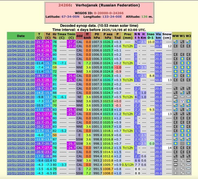Am Sonntag sank die Temperatur in Werchojansk, Jakutien, auf -27,2 °C und markierte damit den vierten Morgen in Folge mit Temperaturen unter -25 °C. Eine solche Kälte zu Beginn der Saison wurde seit Beginn der Aufzeichnungen im Jahr 1885 noch nie im Oktober gemessen.