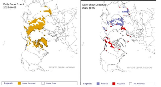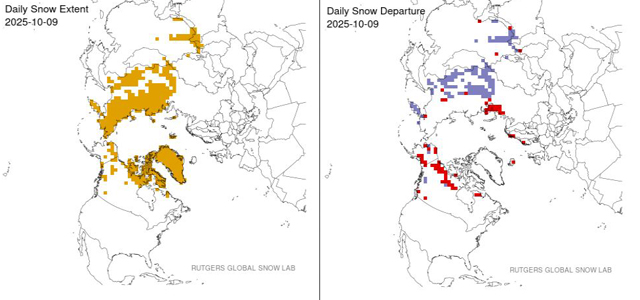 Schneedecke Nordhemisphäre am 9. Oktober 2025. Links: Schneebedeckung, rechts: Abweichung