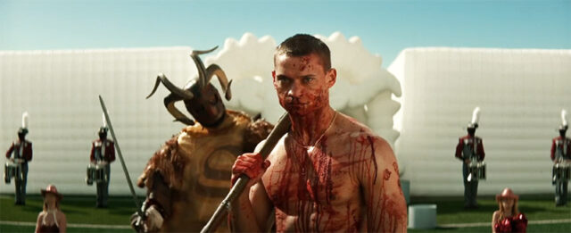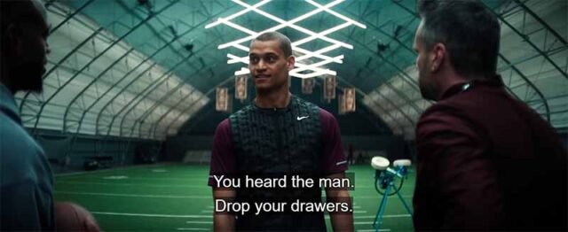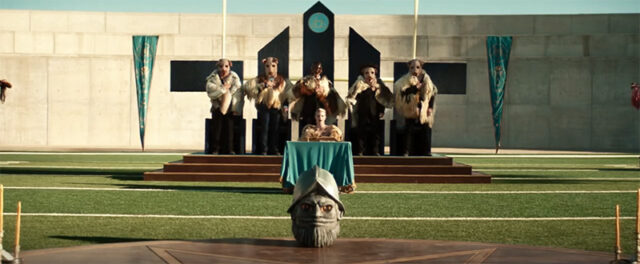 Als Cam den Helm abnimmt, findet er den abgetrennten Kopf seines Trainers. Das Wort „OPFER“ bestätigt, dass es sich um ein … Opfer handelte. Sehr subtil.